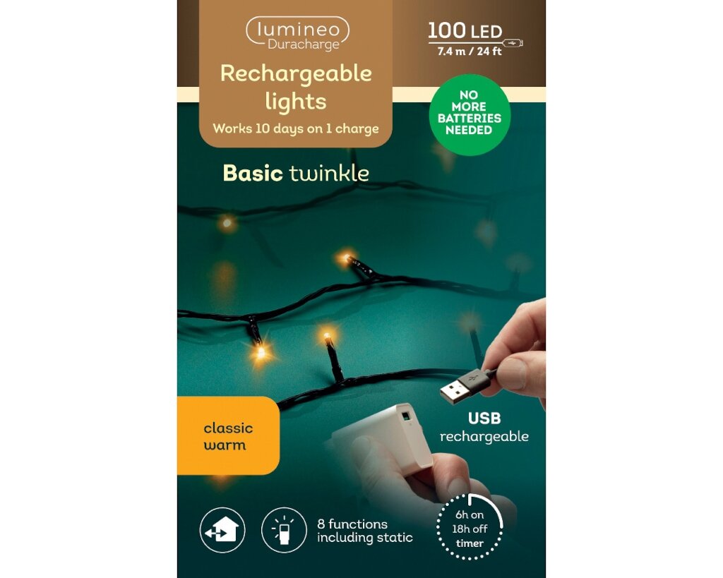 Ontdek de Basic duracharge lights 100 lamps klassiek warm, de perfecte verlichting voor zowel binnen als buiten. Deze sfeervolle lichtketting van 100 LED-lampjes verspreidt een klassiek warm licht dat elke ruimte of tuin direct gezellig maakt. Met de oplaadbare accu hoef je niet meer te zoeken naar stopcontacten en kun je deze verlichting overal plaatsen waar je maar wilt.