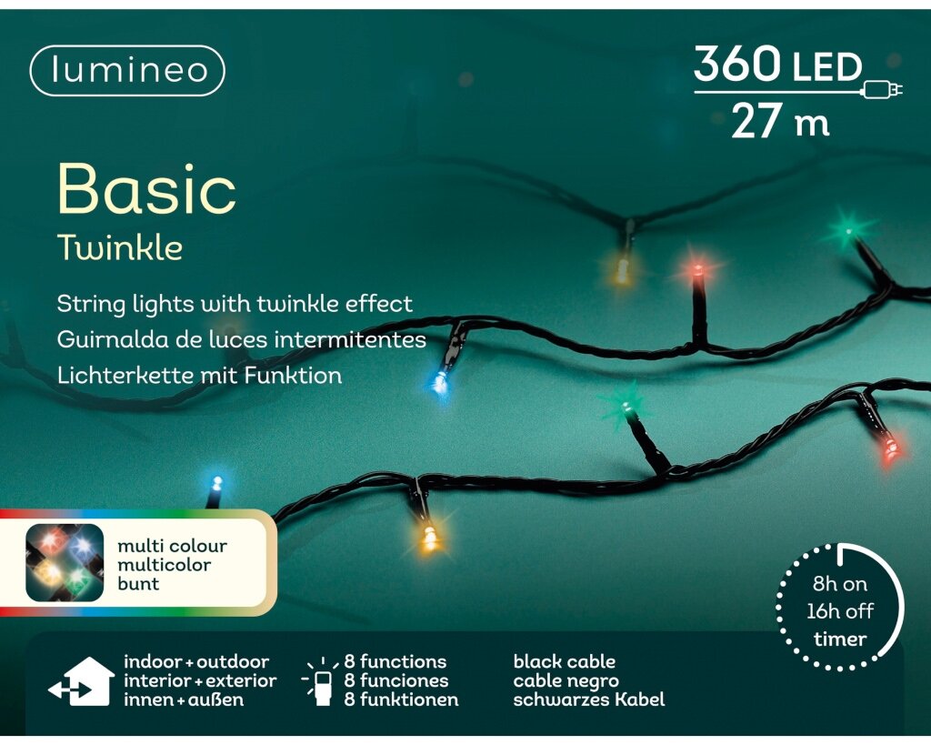 Basic Led verlichting multicolour 360 lampjes: Breng kleur in je kerstsfeer. Creëer een magische kerstsfeer met de Basic Led verlichting multicolour 360 lampjes van Lumineo. Deze sfeervolle rice lights, niet veel groter dan een rijstkorrel, zorgen voor een prachtige lichtverspreiding in je tuin of woning. Met een onderlinge afstand van 7,5 cm tussen de lampjes wordt het licht perfect verdeeld, terwijl het energiezuinige karakter en de lange levensduur je jarenlang plezier garanderen.
