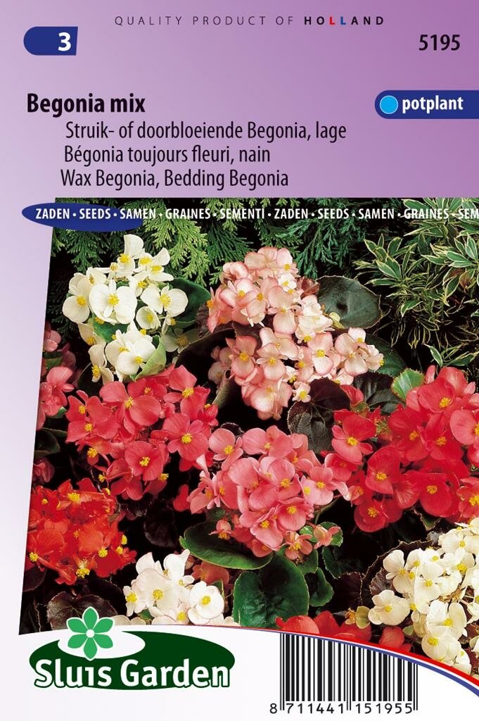Begonia Semperflorens Choice Mix: Kleurrijke schoonheid voor tuin en terras. Begonia Semperflorens zaden Choice mix is een prachtige verzameling laagbloeiende begonia's die je tuin of terras opfleurt met een scala aan levendige kleuren. Deze populaire Sluis Garden variëteit staat bekend om zijn rijke bloei en compacte groeiwijze. Met ongeveer 800 zaden per verpakking kun je volop genieten van deze veelzijdige plant die zowel in de volle zon als halfschaduw uitstekend gedijt.
