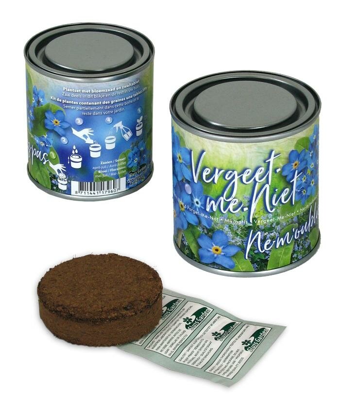 Vergeet-me-niet in blik: een charmant cadeau voor elke gelegenheid. Boeketje in blik Vergeet Me Niet is een origineel en stijlvol cadeau van het merk Sluis Garden. Dit decoratieve blikje bevat alles wat je nodig hebt om prachtige blauwe vergeet-me-nietjes te kweken. Het compacte formaat maakt het een perfect geschenk voor diverse gelegenheden, van verjaardagen tot afscheid. De symbolische betekenis van vergeet-me-nietjes - trouw en herinneringen - geeft dit cadeau een extra emotionele lading die de ontvanger zeker zal waarderen.
