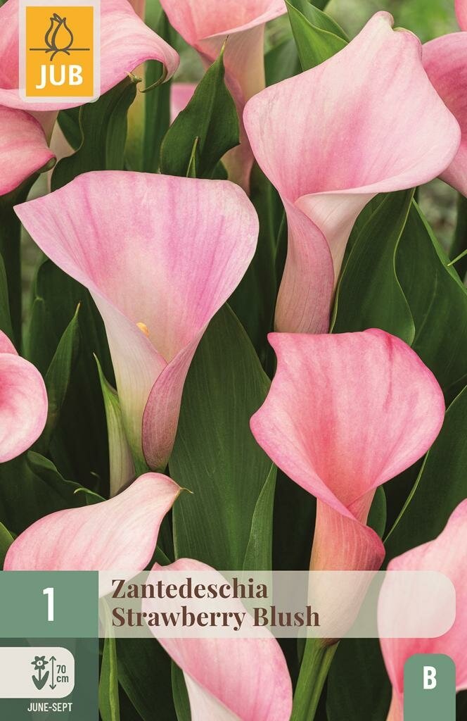 Calla Strawberry Blush: Elegante roze schoonheid voor tuin en terras. Calla Strawberry Blush is een prachtige zomerbloeier met opvallende roze bloemen die je tuin of terras een elegante uitstraling geeft. Deze knolplant van het gerenommeerde merk Jub groeit uit tot een sierlijke verschijning van ongeveer 70 cm hoog. De zachte roze kleur van de kelkvormige bloemen zorgt voor een romantische sfeer in je tuin en combineert prachtig met andere zomerbloeiers.