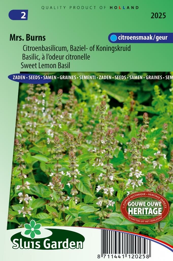 Citroen Basilicum Mrs. Burns: Een unieke smaaksensatie voor je tuin. Citroen basilicum zaden Mrs. Burns is een bijzondere basilicumvariant van het merk Sluis Garden die bekend staat om zijn verfrissende citroengeur en delicate smaak. Deze unieke kruidentoevoeging aan je tuin combineert het beste van twee werelden: de aromatische eigenschappen van traditionele basilicum met een heerlijk citrusaccent. Perfect voor zowel binnen- als buitenteelt, biedt deze plant niet alleen culinaire mogelijkheden maar ook een aangename geur in je leefomgeving.