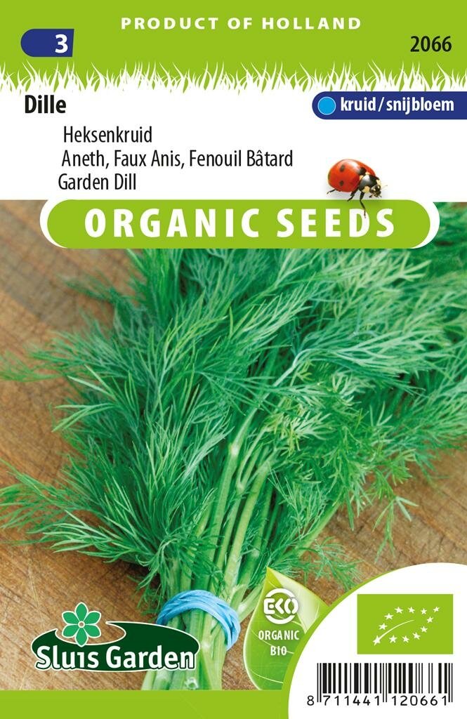 Biologische Dille Zaden Gewone Heksenkruid: Veelzijdig kruid voor tuin en keuken. Biologische Dille zaden Gewone Heksenkruid van Sluis Garden zijn biologisch geteelde zaden van hoge kwaliteit. Deze aromatische kruidensoort, ook wel bekend als heksenkruid, heeft een rijke geschiedenis en veelzijdige toepassingen. De plant kenmerkt zich door geveerd, breekbaar blad en prachtige groengele schermvormige bloemen die niet alleen in de tuin schitteren, maar ook in bloemstukken tot hun recht komen. Het vers gesneden blad verspreidt een heerlijke geur en is perfect voor het op smaak brengen van visgerechten, terwijl de gedroogde zaden onmisbaar zijn bij het inmaken.
