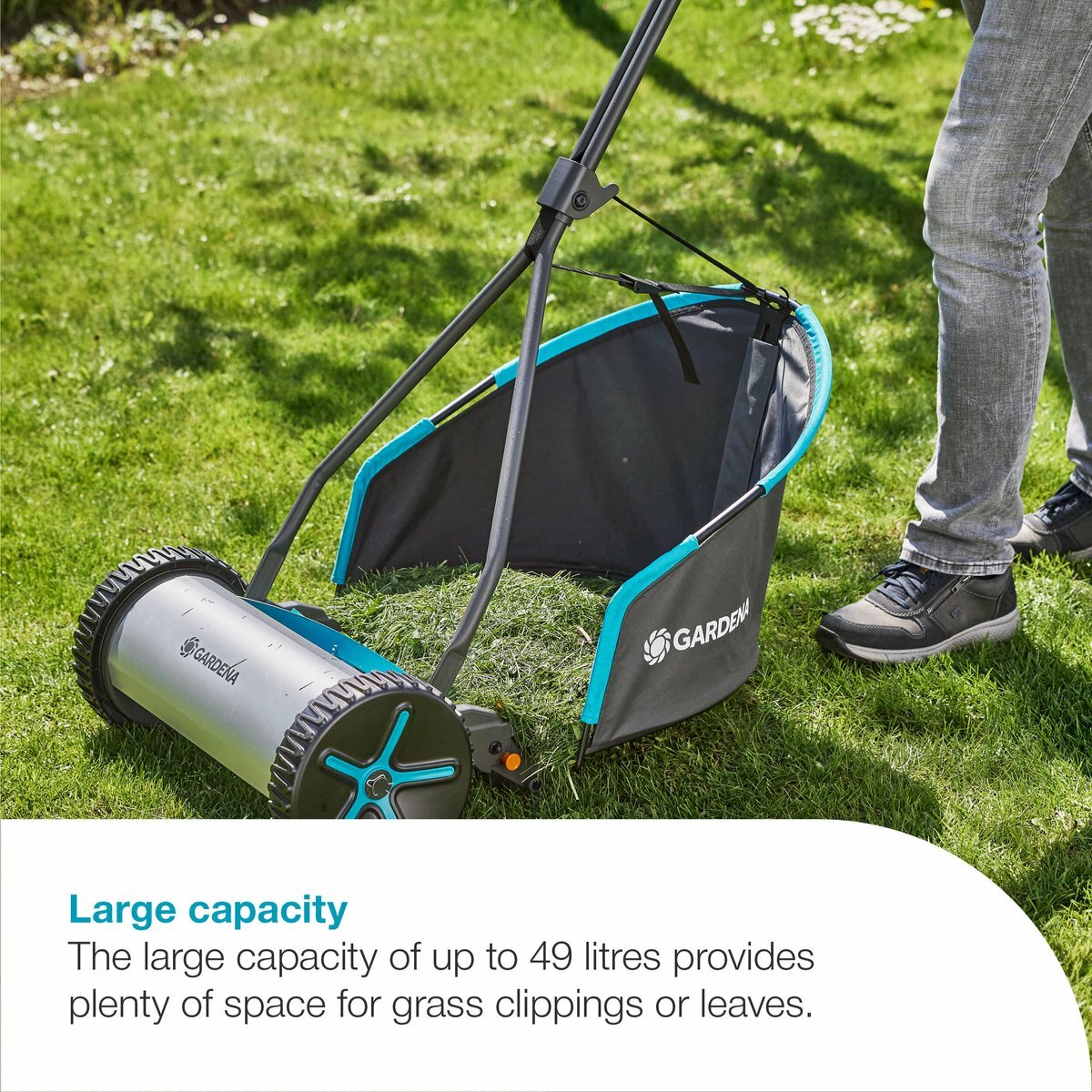 Grote capaciteit: De grote inhoud van maar liefst 49 liter biedt voldoende ruimte voor maaisel of bladeren.