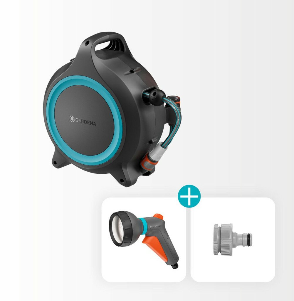 De draagbare slangenbox MoveMatic wordt geleverd met alles wat je nodig hebt om water te geven. Het product wordt geleverd met een Classic watersproeier, apparaathouder en kraanstuk met adapter.