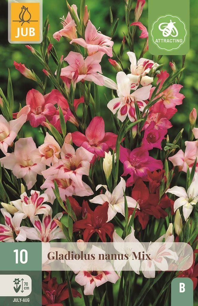 Gladiool Nanus Mix: Kleurrijke zomerbloei voor je tuin. Breng je tuin tot leven met de prachtige Gladiool Nanus Mix van het kwaliteitsmerk Jub. Deze kleinbloemige gladiolen zijn echte blikvangers in elke zomertuin. Met hun sierlijke bloemen in verschillende kleuren en een bescheiden hoogte van ongeveer 70 cm zijn ze perfect voor borders en potten. De mix zorgt voor een kleurrijk schouwspel dat je tuin maandenlang opfleurt.