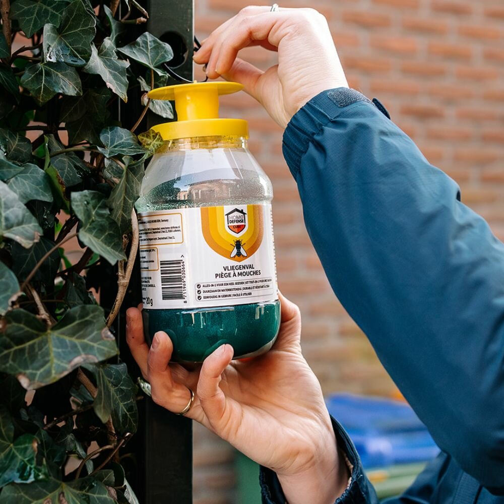 Het gebruik van de Home Defense vliegenval is zeer eenvoudig. Draai de dop van de val en vul deze tot aan de bovenste maatstreep (600ml) met lauw water. Het meegeleverde zakje met lokstof blijft in de fles en lost vanzelf op. Trek vervolgens de bovenkant van de dop omhoog en hang de val buiten op een zonnige, warme plek, ongeveer 5 meter verwijderd van menselijke activiteiten.