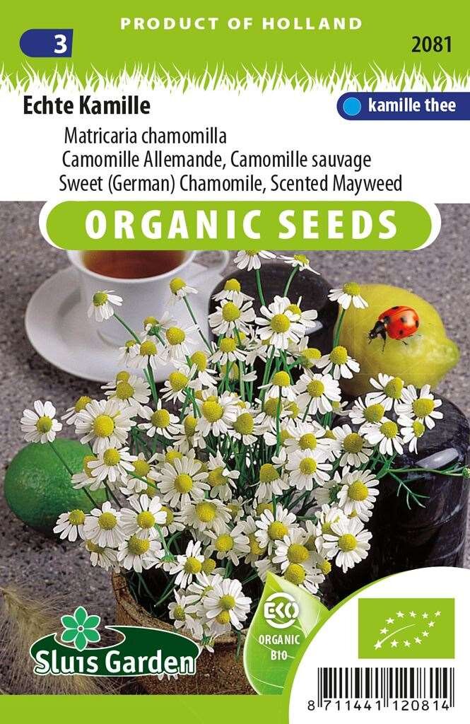 Biologische Kamille Zaden: Natuurlijke rust en genezing in je tuin. Kamille zaden echte Matricaria Recutita BIO van Sluis Garden zijn de perfecte keuze voor iedereen die deze veelzijdige geneeskrachtige plant in eigen tuin wil kweken. Deze biologisch geteelde zaden produceren de echte kamille met zijn kenmerkende sterke geur en hoog gehalte aan etherische oliën. De witte bloemen met gele hartjes zijn niet alleen decoratief in je tuin, maar bieden ook talloze toepassingsmogelijkheden voor gezondheid en welzijn. Met ongeveer 1200 zaden per verpakking heb je ruim voldoende om een prachtige kamillecollectie te starten.