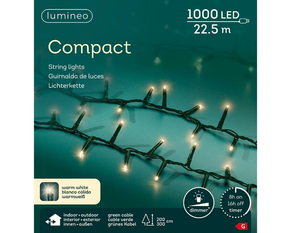 Breng je tuin of woonkamer in kerstsfeer met de Basic kerstverlichting LED compact rice lights 1000 warm wit van Lumineo. Deze sfeervolle verlichting bestaat uit minuscule lampjes, niet veel groter dan een rijstkorrel, die dicht op elkaar zijn geplaatst voor een prachtig clustereffect. Met ongeveer elke 2 cm een lampje creëer je een warme, klassieke uitstraling. Deze energiezuinige LED-verlichting gaat bovendien bijzonder lang mee en is zowel binnen als buiten te gebruiken.