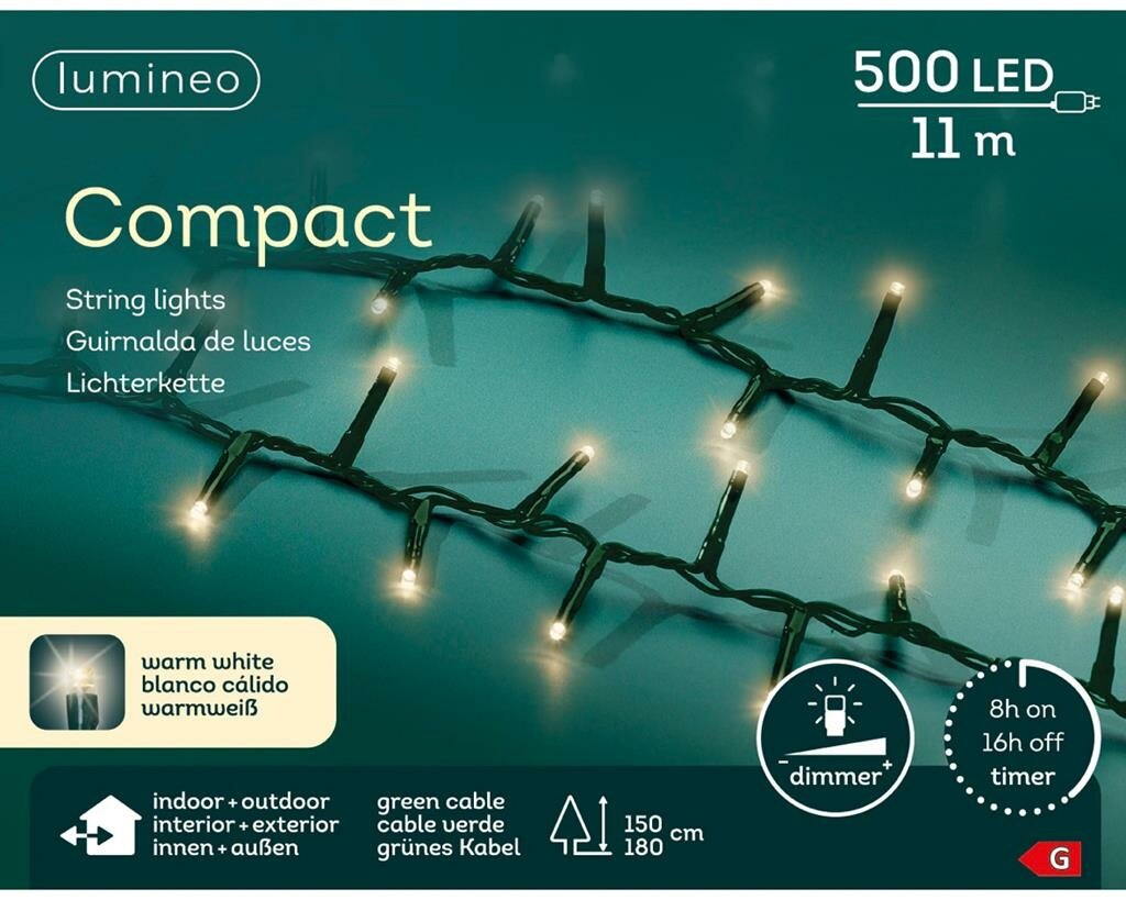 Breng je tuin of woonkamer in kerstsfeer met de Basic kerstverlichting LED compact rice lights 500 warm wit van Lumineo. Deze sfeervolle verlichting bestaat uit minuscule lampjes, niet veel groter dan een rijstkorrel, die dicht op elkaar zijn geplaatst voor een prachtig clustereffect. Met ongeveer elke 2 cm een lampje creëer je een warme, klassieke uitstraling. Deze energiezuinige LED-verlichting gaat bovendien bijzonder lang mee en is zowel binnen als buiten te gebruiken.