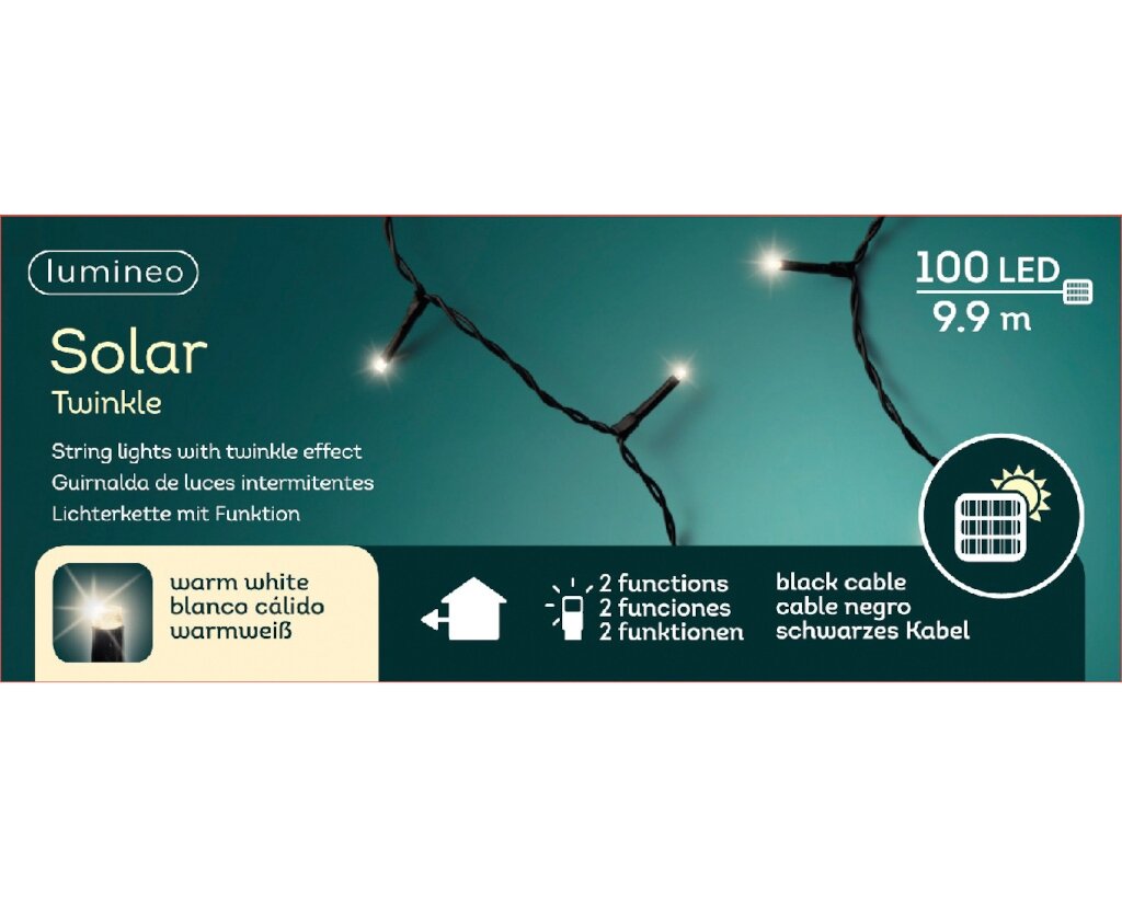 Kerstverlichting solar twinkel 100 lamps warm wit is een sfeervolle lichtoplossing voor je tuin of terras. Deze uitgebreide set van Lumineo bestaat uit 100 kleine LED-lampjes die niet veel groter zijn dan een rijstkorrel. Met een totale lengte van 9,9 meter en een warm witte lichtkleur creëer je in een handomdraai een magische sfeer in je buitenruimte. Het bijzondere aan deze verlichting is de combinatie van zonne-energie én USB-oplaadmogelijkheid, waardoor je altijd verzekerd bent van prachtige verlichting.