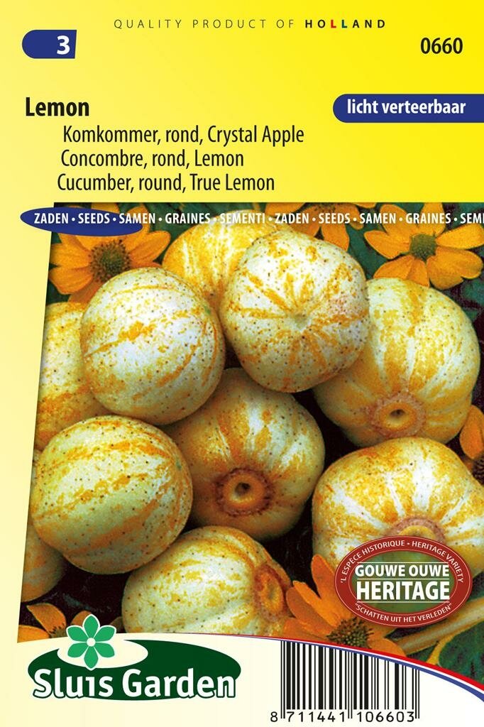 Ontdek de Unieke True Lemon komkommer. Komkommer zaden True Lemon is een bijzonder oud landras uit 1894 dat door Sluis Garden opnieuw beschikbaar is gemaakt voor tuinliefhebbers. Deze komkommer onderscheidt zich door zijn opvallende uiterlijk dat sterk lijkt op een citroen, en door de zeer lichte verteerbaarheid van de vruchten. Perfect voor wie op zoek is naar een karaktervolle komkommer met een rijke geschiedenis.
