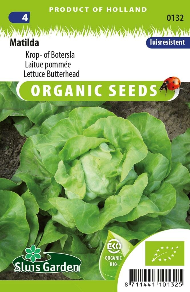 Biologische Krop- of Botersla Matilda: Smaakvolle bladgroente voor je moestuin. Krop- of Botersla Matilda BIO zaden van Sluis Garden zijn de perfecte keuze voor tuiniers die op zoek zijn naar een kwalitatief hoogwaardige biologische sla. Deze sla vormt snel een mooie krop met een aantrekkelijke groene kleur. De Matilda-variëteit is niet alleen geliefd bij hobbytuinders, maar wordt vanwege zijn uitstekende eigenschappen ook in de professionele teelt gebruikt. De sla is resistent tegen groene bladluis en gedeeltelijk tegen meeldauw, wat zorgt voor een probleemloze teelt en een gezonde oogst.