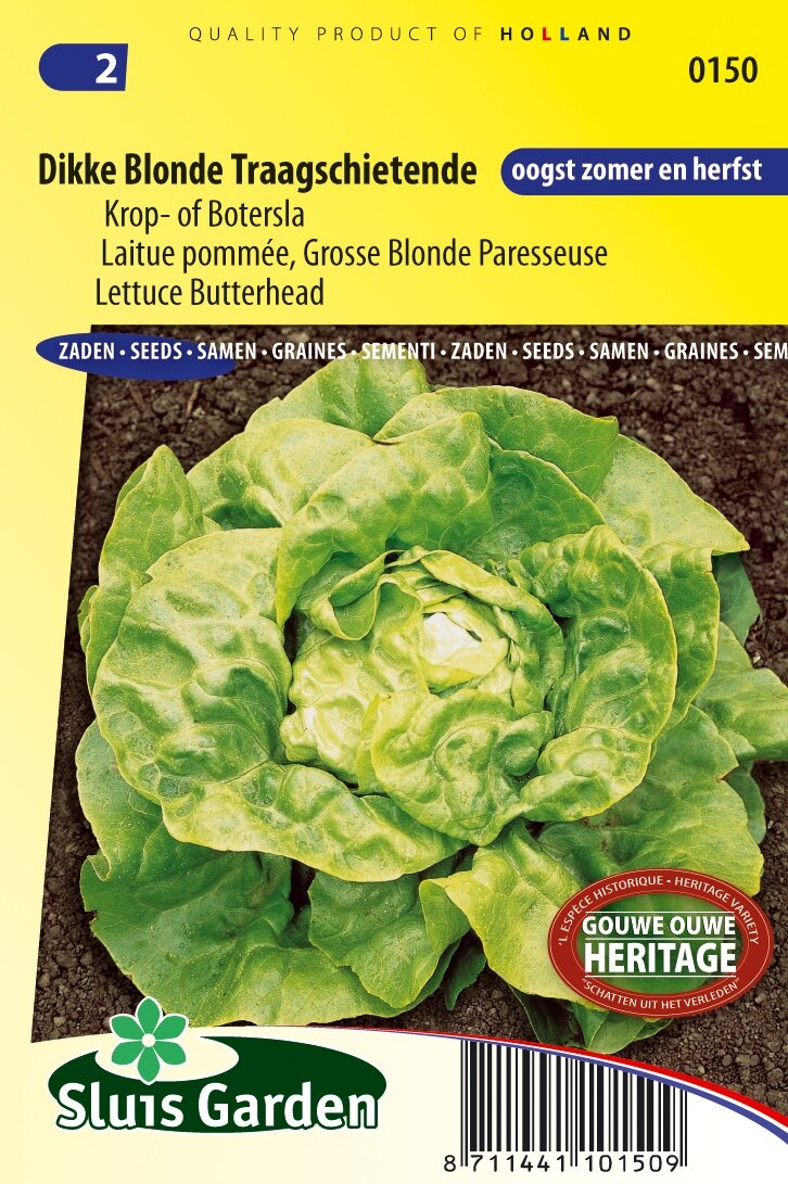 Kropsla Dikke Blonde Traagschietende: De perfecte keuze voor je moestuin. Kropsla Dikke Blonde Traagschietende is een hoogwaardige botersla van het merk Sluis Garden die bekend staat om zijn frisgroene uiterlijk en goudgele hart. Deze traagschietende variëteit is speciaal ontwikkeld voor de zomer- en herfstteelt, waardoor je langer kunt genieten van verse sla uit eigen tuin. De kropsla vormt grote, volle kroppen en kan al bij relatief lage temperaturen (vanaf 10°C) worden gezaaid.