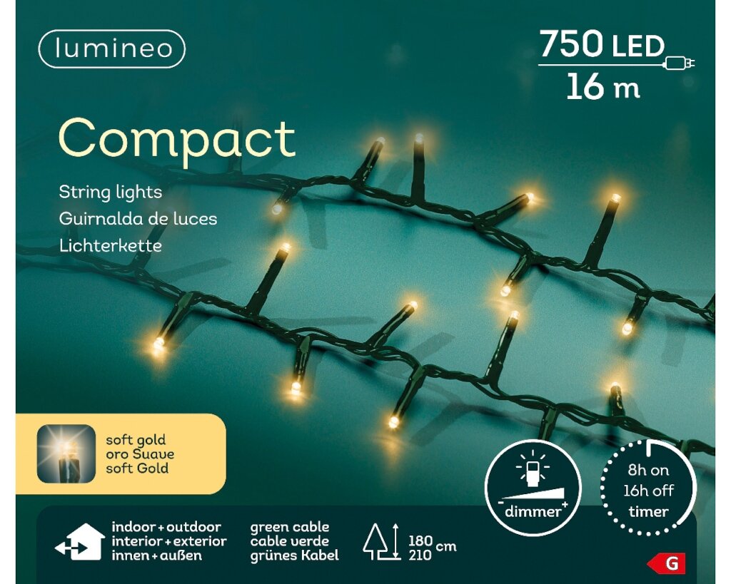 LED Compact Rice Lights 750 Lamps Soft Gold van Lumineo is een stijlvolle en energiezuinige kerstverlichting die zowel binnen als buiten gebruikt kan worden. Met 750 warme, zachtgouden LED-lampjes op een groen snoer van 16 meter creëer je in een handomdraai een sfeervolle ambiance tijdens de feestdagen. Deze compacte rijstlichtjes zijn de perfecte keuze voor wie op zoek is naar hoogwaardige kerstverlichting met een warm, uitnodigend licht.