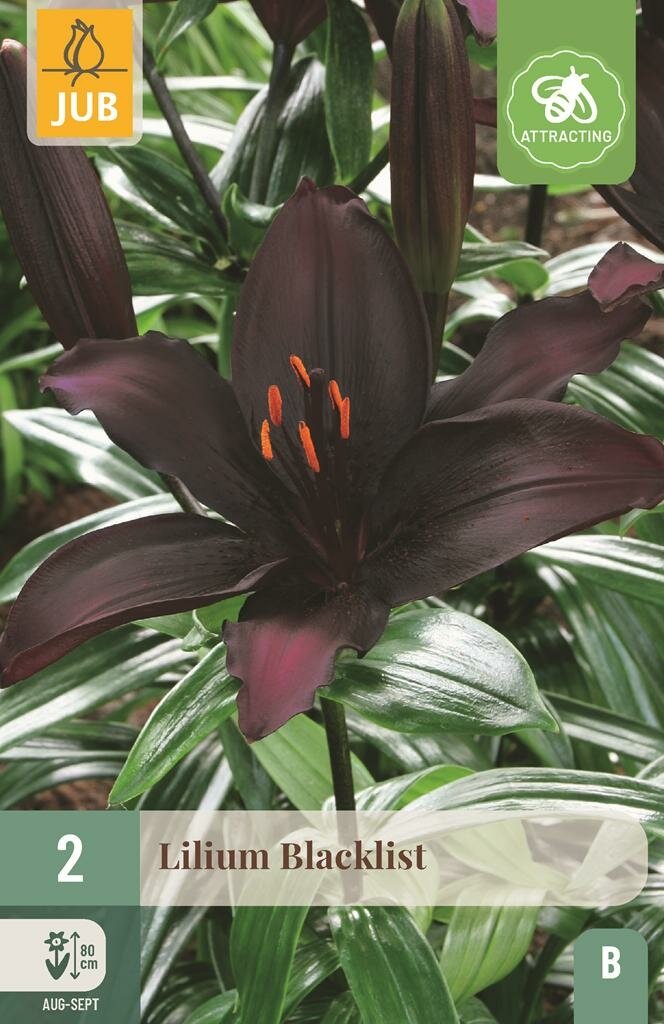 Lelie Blacklist: Elegante paarse schoonheid voor je tuin. Ontdek de prachtige Lelie Blacklist, een indrukwekkende Aziatische lelie van het merk Jub met een opvallende paarse bloem. Deze elegante zomerbloeier wordt ongeveer 90 cm hoog en vormt een schitterend accent in borders, perken of plantenbakken. De Blacklist behoort tot de klassieke Aziatische lelies, ook wel bekend als de 'gewone lelies', maar heeft met zijn rijke paarse kleur niets gewoons te bieden.