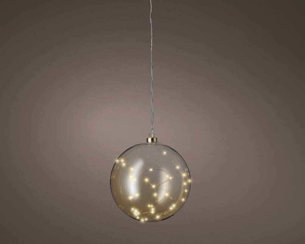Breng sfeer in huis met de Micro led bal 20 cm amber klassiek warm. Deze stijlvolle glazen bol met subtiele micro verlichting creëert een warme, gezellige ambiance in elk interieur. Met het meegeleverde draad hang je deze decoratieve lichtbron eenvoudig op. De amber glazen bol met 40 klassiek warm LED-lampjes is een sfeervol accent voor je woonkamer, slaapkamer of als feestelijke decoratie.