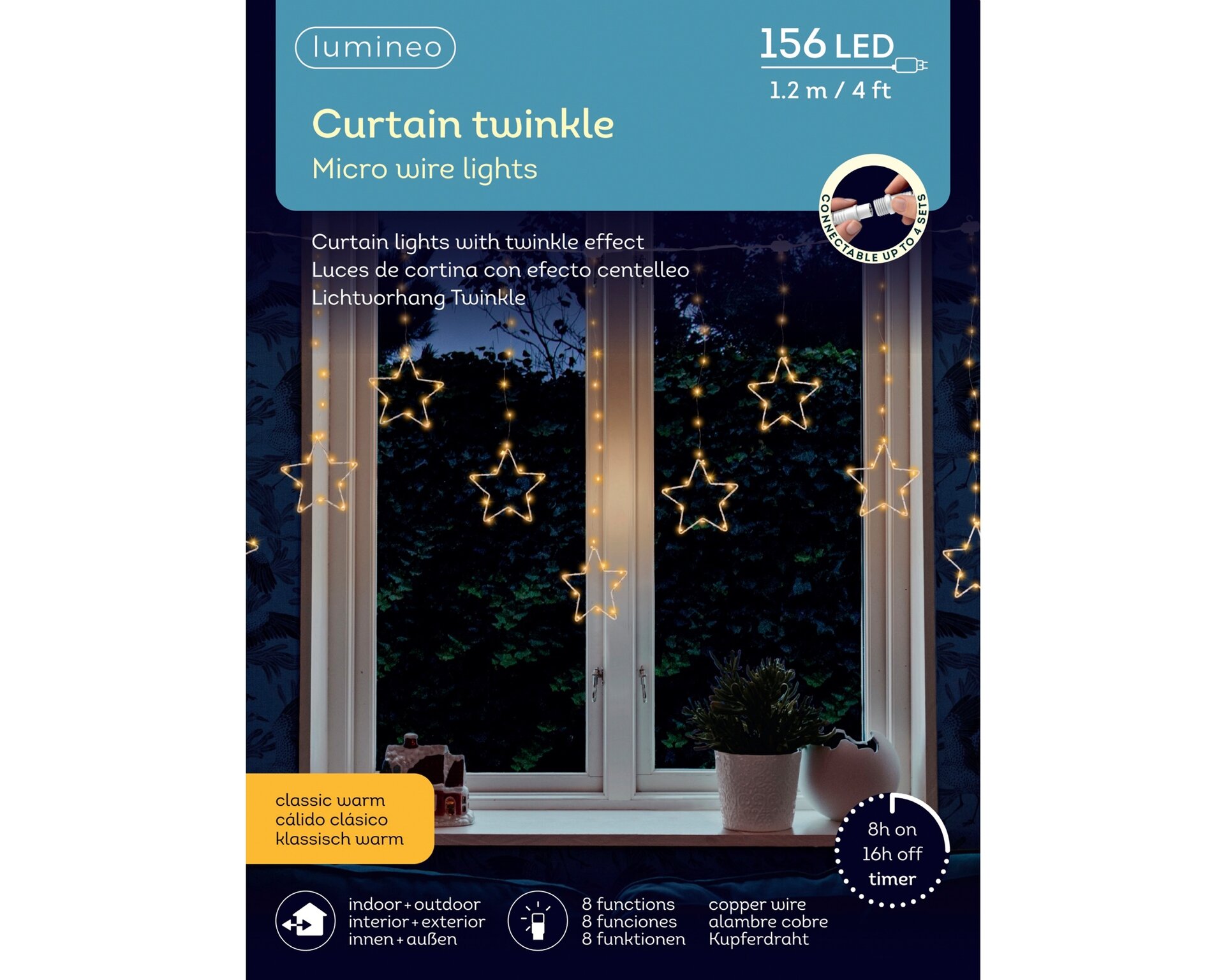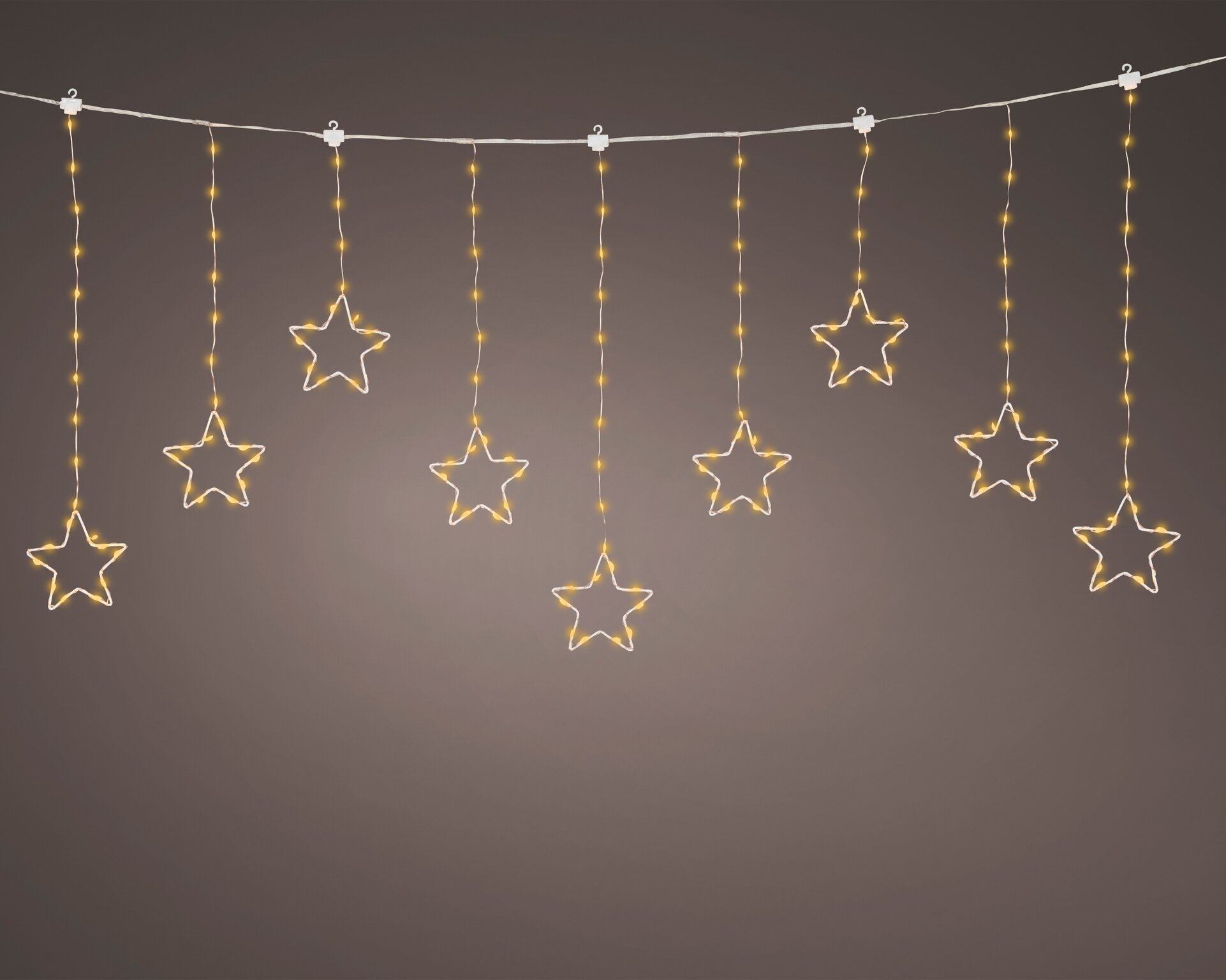 Dit sterrengordijn is geschikt voor binnengebruik en komt het mooist tot zijn recht voor het raam. De klassiek warme verlichting valt direct op maar blijft prettig voor de ogen. Door de verschillende hoogtes waarop de sterren hangen, creëer je een speels en dynamisch effect. Dankzij het lange aansluitsnoer plaats je de verlichting precies waar je wilt. De verschillende twinkelfuncties laten je eenvoudig de sfeer aanpassen aan je wens.