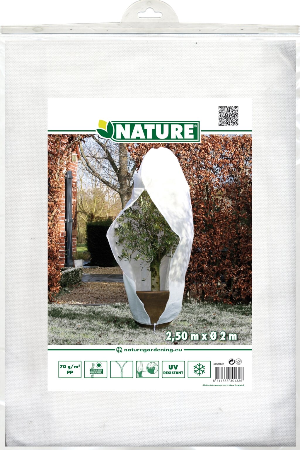 Bescherm je planten en bomen effectief tegen vorst met de winterafdekhoes met rits H 250 cm D 200 cm wit van Nature. Deze speciaal ontworpen hoes is gemaakt van wit, niet-geweven polypropyleen met een dichtheid van 70 g/m². De hoes is voorzien van een praktische ritssluiting en een aantrekkoord voor snelle en eenvoudige bevestiging rond je kostbare tuinplanten.