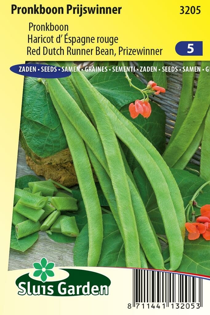 Pronkboon zaden Prijswinner: een decoratieve en smakelijke aanwinst voor je tuin. Pronkboon zaden Prijswinner is een bijzonder decoratief roodbloeiend ras van Sluis Garden dat niet alleen een lust voor het oog is, maar ook heerlijke bonen produceert. Met zijn opvallende rode bloemen en lange, vlezige groene peulen van ongeveer 27 cm met paarsrode, zwart gestreepte zaden is deze pronkboon een waardevolle toevoeging aan elke moestuin.