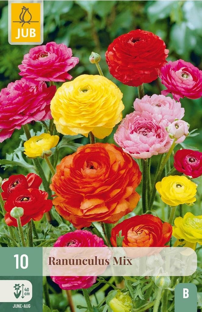 Ranonkel Mix: Kleurrijke Boterbloemen voor Jouw Tuin. De Ranonkel Mix van het merk Jub is een prachtige verzameling knollen die in de volksmond ook wel boterbloemen worden genoemd. Deze kleurrijke bloemen met hun dichte, rozetvormige bloemen zorgen voor een opvallend accent in elke tuin. Met hun levendige kleuren en elegante vorm zijn ze perfect voor borders en potten. De mix bevat 10 knollen in verschillende kleuren die uitgroeien tot ongeveer 40 cm hoge planten met een rijke bloei van juni tot augustus.