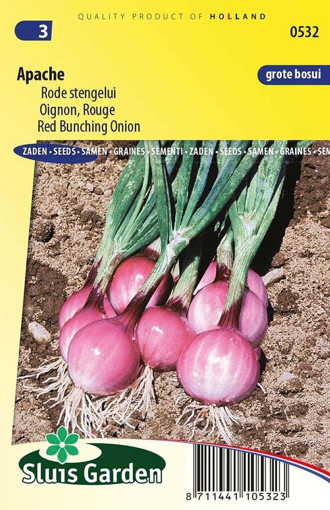 Rode Stengelui Apache: Kleurrijke smaakmaker voor je tuin. Rode stengelui Apache is een veelzijdige ui-variëteit van het merk Sluis Garden die zowel als stengelui gebruikt kan worden als doorgroeit tot glimmende paarse, ovaalronde bosuitjes. Deze smaakvolle ui is lang houdbaar en perfect voor rauwe toepassingen in salades. Met zijn opvallende rode kleur en milde smaak is deze stengelui een aanwinst voor elke moestuin en geeft hij je gerechten een kleurrijke twist.