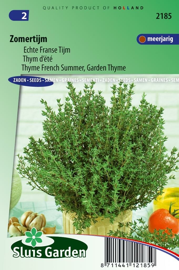 Tijm zaden echte zomertijm: aromatische kruiden voor je tuin. Tijm zaden echte zomertijm van Sluis Garden is een veelzijdige aanwinst voor je kruidentuin. Deze Thymus vulgaris bloeit in de volgende jaren met prachtige lila of roze, soms witte bloemen in mei en juni. Het kruid heeft een heerlijk aromatische geur en een verwarmende werking die de vertering van voedsel ondersteunt. De sterke smaak blijft zelfs na drogen behouden, waardoor je het hele jaar door kunt genieten van deze klassieke keukenkruiden.